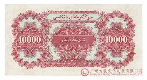 1949年9月25日新疆省和平解放,为安定民心、避免社会震荡、维持新疆的稳定,中央人民政府决定新疆继续发行和流通新疆省银元券,并以银元券统一了新疆的币制(以新疆省银元券收兑了在伊犁、塔城、阿山三个地区流通的三区期票)。经过两年努力,新疆经济得到恢复和发展。1951年9月21日,中央人民政府政务院宣布在新疆发行有维吾尔文的人民币(图3),在全国流通,同时停止使用并限期收回新疆省银行发行的银元券,从此人民币成为新疆省的本位货币。
