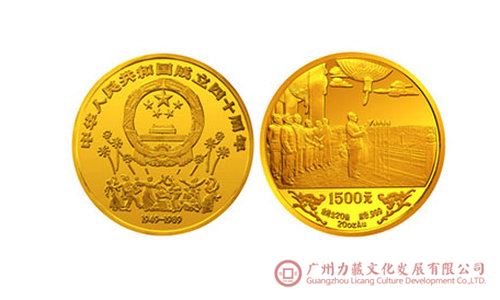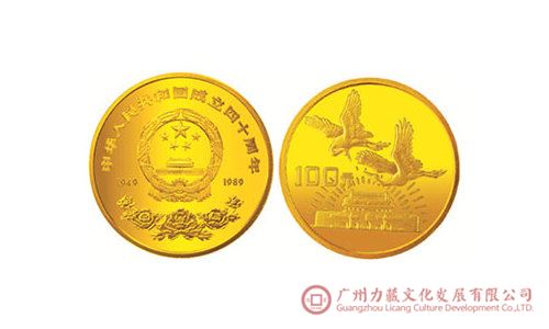 1989年中国人民银行发行中华人民共和国成立40周年金银纪念币,一套4枚。其中20盎司金质纪念币正面图案为中华人民共和国国徽、民族团结图、纪念主题文字;背面图案为开国大典,并刊面额。
