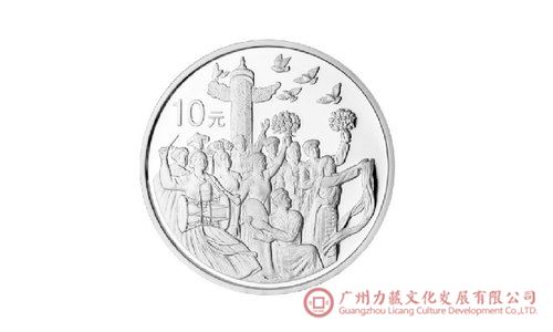 1盎司银质纪念币背面图案为民族团结,并刊面额。