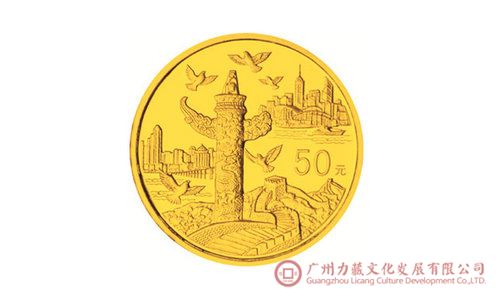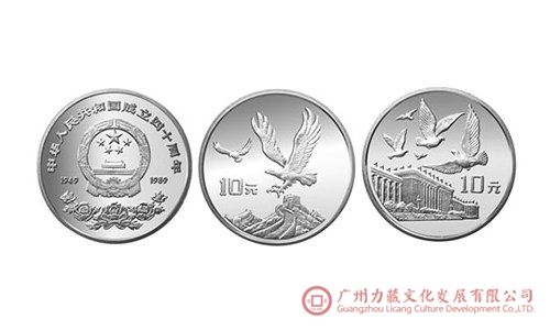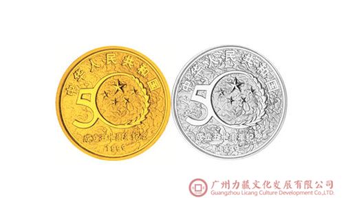 1999年中国人民银行发行中华人民共和国成立50周年金银纪念币,一套6枚。金银纪念币正面图案均为“50”的艺术造型,并刊国名及“成立五十周年纪念”字样及年号。