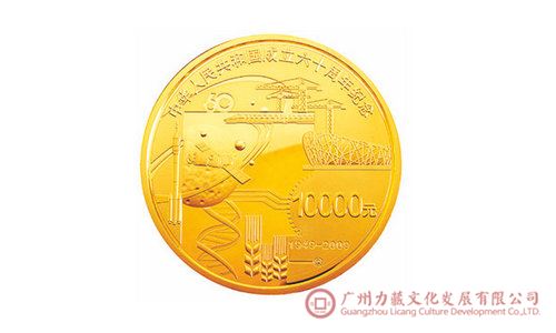 1公斤金质纪念币背面图案为火箭、卫星、高速列车、奥运场馆、吊塔、齿轮、麦穗及DAN链、电子信息符号等造型,并刊“中华人民共和国成立六十周年纪念、1949-2009”字样及面额。