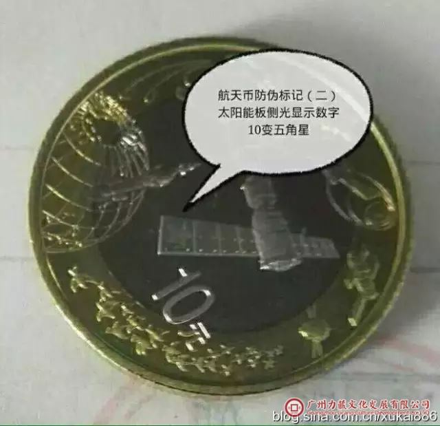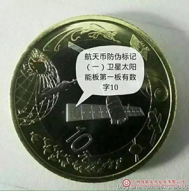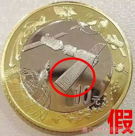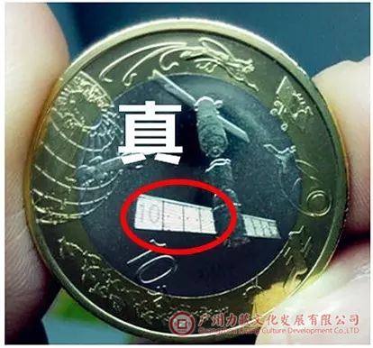两者的制作工艺有显著差别,假币的图案比较模糊,在卫星、飞天和国徽的细节上有大量缺失,航天纪念币最主要的防伪点在于卫星太阳能板的最下缘,随着观看角度的不同,会呈现出数字“10”或五角星“★”,而假币目前没有这样的仿造技术。