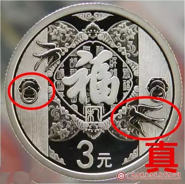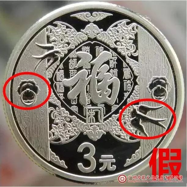 真币门环处的铆钉清晰可见,且铆钉均匀立体感十足,燕子身上的线条清晰。而假币的门环铆钉看不到,燕子就一只光燕,没有丝毫立体感。