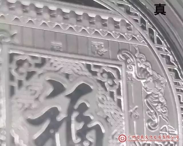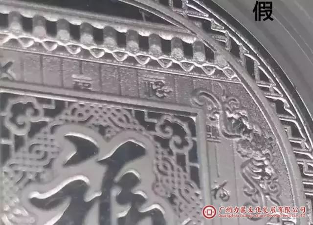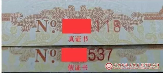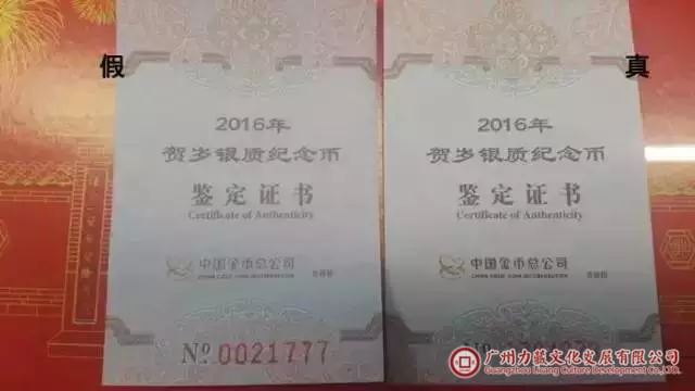 真鉴定证书纸张的底部纹路是单一的竖行波浪;而假鉴定证书底部纹路则不单一。真鉴定证书字迹清晰;假的则字迹较淡,如“中国金币总公司”这几个字就明显不同。下面是细节放大图,会看的更清楚。