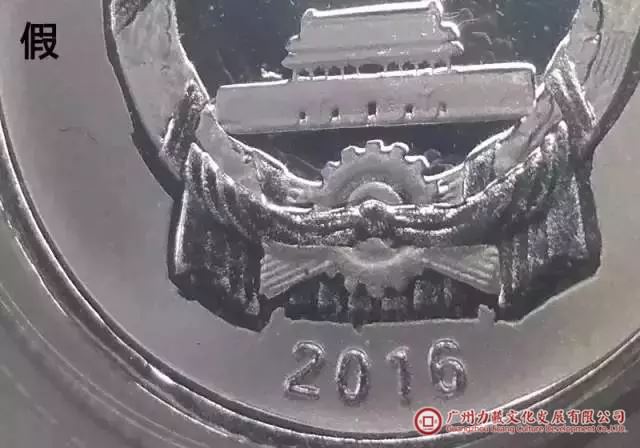 ▲局部上看,假币天安门、国徽的齿轮和飘带都不精致,币面毛躁。