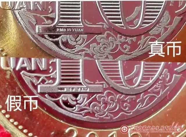 四、面额数字上采用了隐形文字的防伪技术,与航天币的防伪技术类似,真币在不同的角度下会呈现出“RMB”或“10 10 10”,而假币只有RMB,并不会随着观察角度的不同而变化。