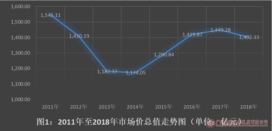 在2011年时,2011年大盘的市场价总值1,542.81亿元,到2018年时下行到864.68亿元,市值蒸发43.95%。同时2018年与2017年相比市场价总值下降9.65%.