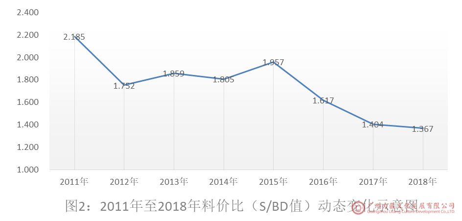 直接指标主要是贵金属变动成本溢价率S/BD值(俗称料价比)。2011年至2018年现代贵金属币整体平均料价比的变化见图2。