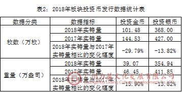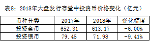 2018年大盘发行存量投资金币2018年市场价总值613.17亿元,与2017年相比下降6.00%,投资银币2018年市场价总值71.98亿元,与2017年相比下降9.41%。