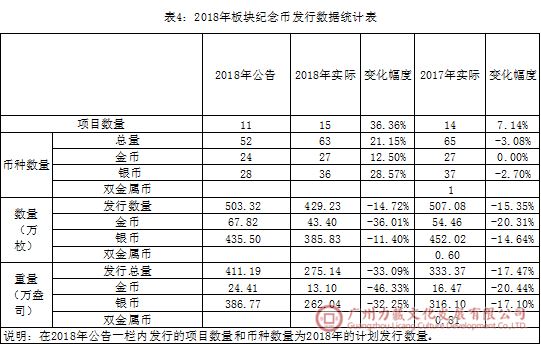 2018年板块实际发行纪念币项目15个,与2018年计划相比增加4个项目,与2017年实际相比增加1个项目;实际发行纪念币63种,与2018年计划相比增加11个币种,与2017年实际相比减少2个币种;实际发行枚数429.23万枚,与2018年公告量相比下降14.72%,与2017年实际铸造量相比下降15.35%,实际发行纪念币重量275.14万盎司,与2018年公告量相比下降33.09%,与2017年实际铸造量相比下降17.47%。