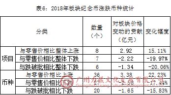 在2018年板块的纪念币中,与零售价相比整体上涨的项目8个,整体下跌的项目7个,其中有6个项目整体性跌破批发价;与零售价相比整体上涨的币种36个,整体下跌的币种27个,其中有20个币种跌破批发价。