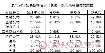 在2018年板块中:①投资金币“金融机构”销售占比47.42%,“特许经营”销售占比34.21%,直属机构销售占比1.67%。②投资银币“特许经营”销售占比53.03%,“金融机构”销售占比28.39%,“直属机构”占比0.37%。③纪念币“直属机构”销售配额占比49.90%,“特许经营”销售占比20.52%,“金融机构”销售占比13.99%。