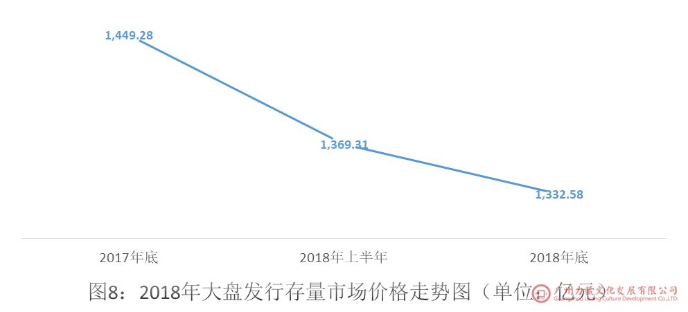 在2018年大盘发行存量中,2017年底的市场价总值1449.28亿元,2018年六月底下行到1369.31亿元,下降幅度5.52%。到2018年底市场价总值为1332.58亿元,与2017年相比下降8.05%,与2018年中期相比下降2.53%。