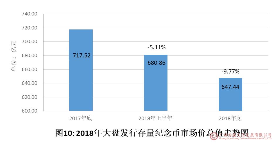在2018年大盘发行存量的纪念币中,2018年中期市场价总值680.86亿元,2018年底市场价总值647.44亿元,与2017年相比分别下降5.11%和9.77%。
