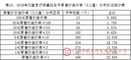 2018年大盘发行存量纪念币中零售价溢价率分布见表10。
