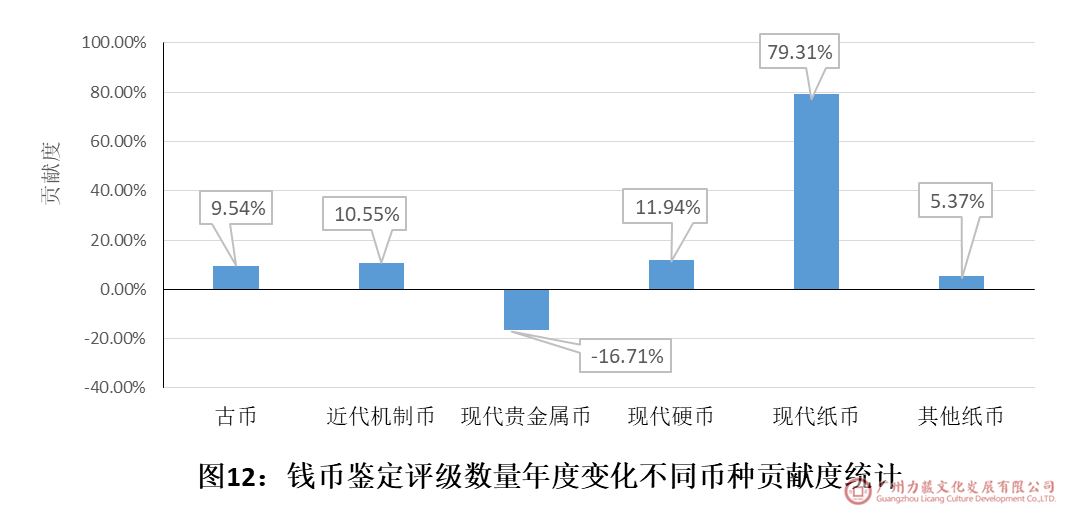 在2018年的增量变化中,“古币”“近代机制币”“现代硬币”和“其它纸币”在增加值中都有不同程度的贡献,其中“现代纸币”(包括现代流通纸币和普通纪念币纸币)的贡献度高达79.31%,“现代贵金属币”对增加值的贡献度为负16.71%,也就是说2018年与2017年相比,“现代贵金属币”的钱币鉴定评级数量不增反降。