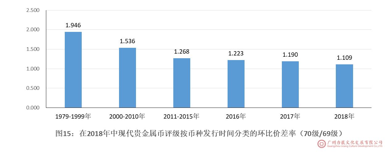 在2018年送评的评级币中,按币种发行年度分类的“70级/69级”的平均环比差价率见图15。