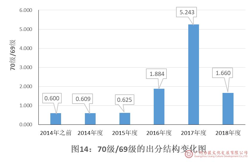 在2014年之前至2015年,年度出分结构“(70级评级量)/(69级评级量)”稳定在0.600至0.625之间,2016年度开始出现大幅上涨,数据录得1.844,2017年度这一数据达到惊人的5.243,2018年度开始出现理性回归,数据录得1.660。