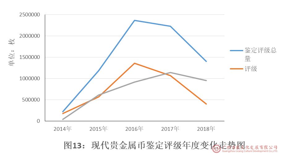 2014年后“现代贵金属币”的年度规模迅速扩大,2016年达到市场发展的顶峰,2016年后开始掉头向下,出现年度鉴定评级规模持续下行的态势。2018年与2017年相比,总量下降36.95%,其中评级下降61.87%,封装币下降13.39%。