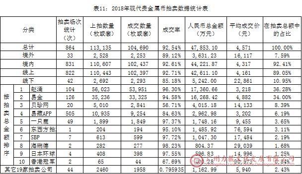 2018年在29家拍卖公司举办的864场拍卖会中,上拍现代贵金属币共计11.31(万枚套),成交拍品10.47(万枚套),成交率92.54%,成交总金额折合人民币4.79亿元。