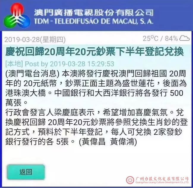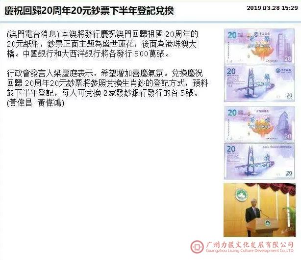 行政会发言人梁庆庭表示,已完成讨论《发行庆祝澳门回归祖国20周年的澳门元贰拾圆纸币》行政法规草案,许可中国银行股份有限公司及大西洋银行股份有限公司,发行庆祝澳门回归祖国20周年的面额为澳门元20元的新纸币,每间发行银行的发行限额为500万张。钞票正面以“盛世莲花”雕塑为主景,雕塑旁矗立发钞银行的大楼,体现发钞银行与澳门特区共同成长,辅景为澳门海岸的全景;钞票背面以“港珠澳大桥”的“中国结”塔桥为主景,象征澳门特区与中国内地经济文化的沟通,辅景采用澳门历史城区建筑物组成,展现澳门特区独特的历史背景与文化魅力。