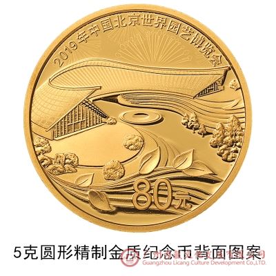 5克圆形金质纪念币背面图案为中国馆建筑造型及植物装饰图案等组合设计,并刊“2019年中国北京世界园艺博览会”中文字样及面额。