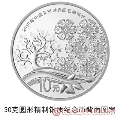 30克圆形银质纪念币背面图案为国际馆建筑局部造型及植物装饰图案等组合设计,并刊“2019年中国北京世界园艺博览会”中文字样及面额。