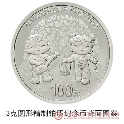 3克圆形铂质纪念币背面图案为吉祥物及植物装饰图案等组合设计,并刊“2019年中国北京世界园艺博览会”中文字样及面额。