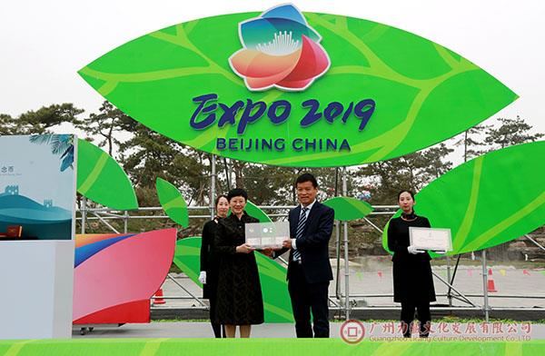 中国金币总公司副总经理白丽冰向世园局赠送2019年中国北京世界园艺博览会贵金属纪念币一套,北京世园局总经济师林晋文代表世园局接受赠送