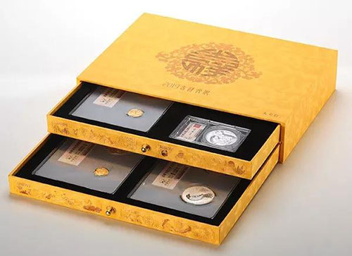2019吉祥文化金银币大全套和银币大全套采用了抽屉式包装盒,中间印有吉祥纹饰,及四个系列的名称和代表图案。四个主题的封装币包装盒采用经典的天地盒样式。封装币采用了全新设计的彩色封装标签,配以四个主题系列名称篆体印章,彰显出了“吉祥”的主题。