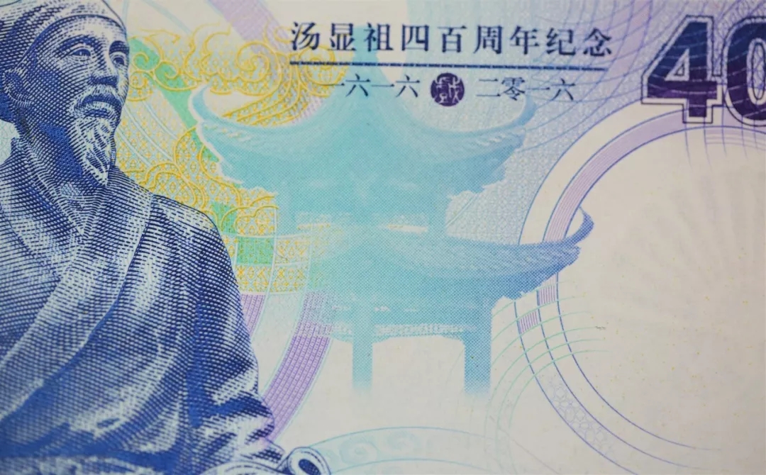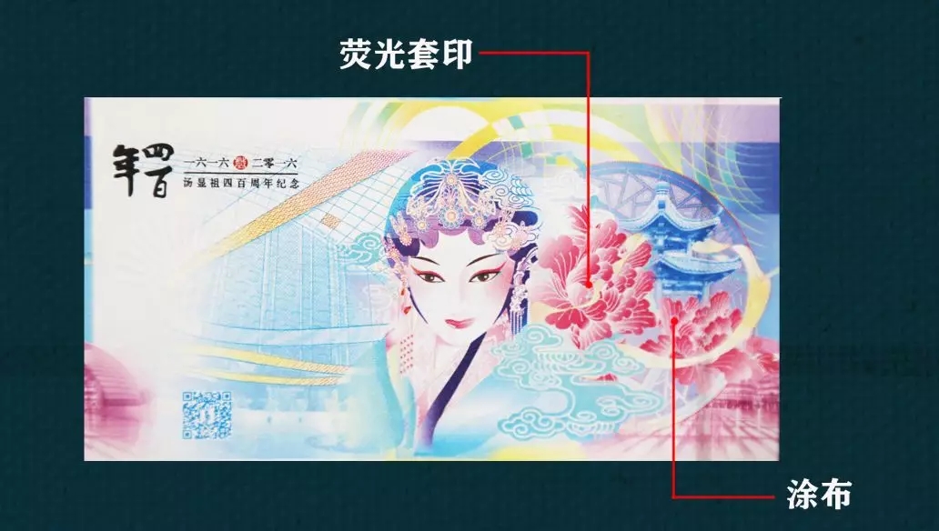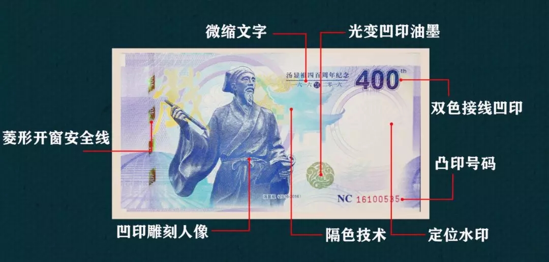 下面这张汤显祖纪念券,就采用了中国先进的特种防伪印刷技术印制,集中展现了我国尖端特种印刷防伪工艺技术,券面共有10处特殊防伪,还有AR技术加持!