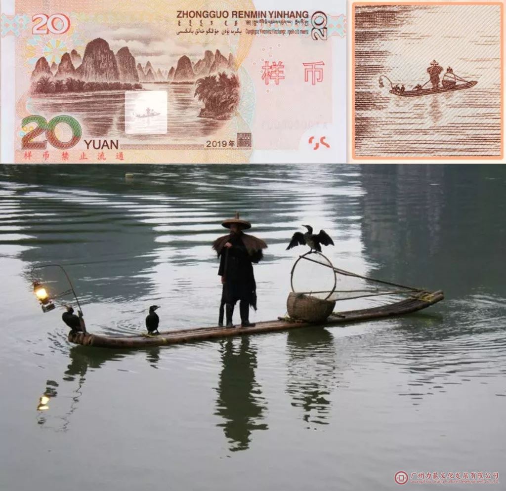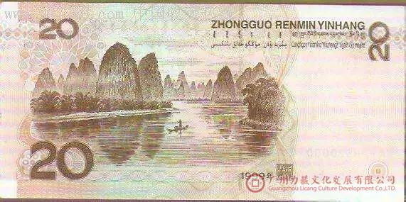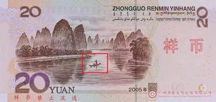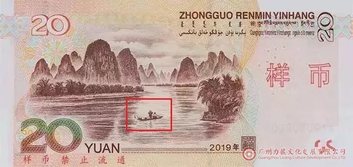 一张纸币最明显的艺术特征,是票面的绘画设计艺术。20元纸币采用桂林山水作为背面图案。