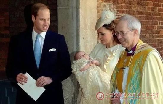 2013年,乔治王子出生后三个月,在伦敦圣詹姆斯宫的皇家教堂接受了基督教的洗礼。仪式由坎特伯雷大主教主持。为纪念乔治王子受洗,英国皇家造币厂推出了一系列纪念币,包括金的、银的、铂的、合金的……纪念币的图案采用与王室传统洗礼相关的百合花束,两旁各有一个弹奏竖琴的小天使。