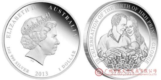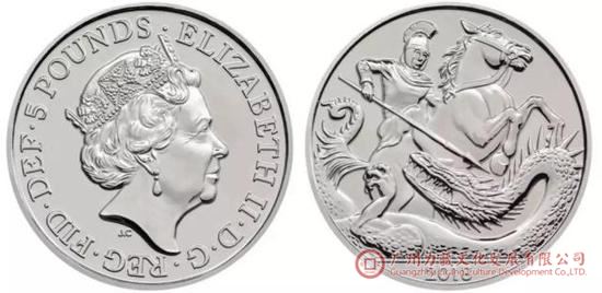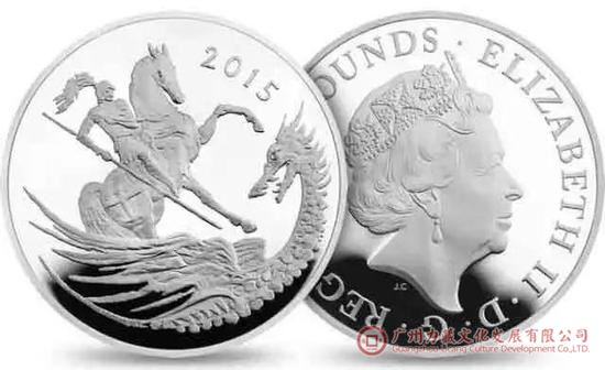 2013年,王室第三顺位继承人乔治王子诞生时,英国皇家造币厂铸造了纪念银币,正面为女王头像,背面为圣乔治屠龙题材。