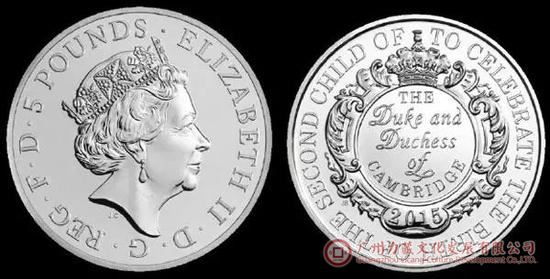 2015年,夏洛特小公主诞生,她是仅次于祖父查尔斯王子、父亲威廉王子和哥哥乔治王子的英国王位第四顺位继承人。英国皇家造币厂特铸造面额5英镑纪念币一枚。正面图案按惯例为女王伊丽莎白二世头像,背面有“庆祝剑桥公爵及夫人喜获次女”字样,衬以花饰镶板、小冠冕及百合花等。