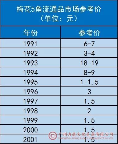 从上表来看,尽管梅花5角的市场参考价跟去年刚宣布退市之时无法相比,但相较去年底来说已经有了明显的涨幅;此外91-94年的梅花5角市场价明显高于其他年份,尤其是93年的梅花5角!