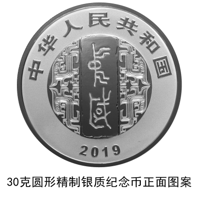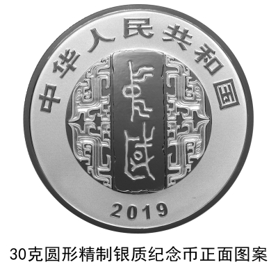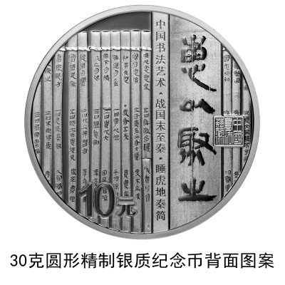 30克圆形银质纪念币背面图案为战国末至秦睡虎地秦简局部文字及“惠以聚之”字样与“中国书法艺术”篆刻钤印等组合设计,并刊“中国书法艺术·战国末至秦·睡虎地秦简”字样及面额。