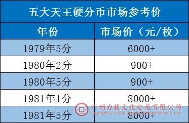 五大天王涨幅惊人,因为当时这些硬分币没有进入流通,而是用来配册赠送、出售给外宾,所以国内存量稀少。五大天王硬分币市场参考价如下: