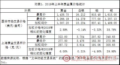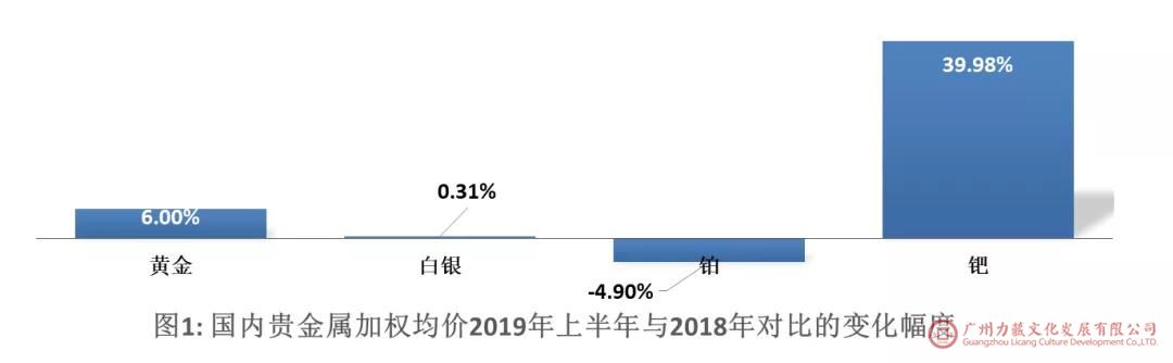 如附表1和图1所示,在2019年上半年,国内市场黄金价格最低277.50(元/克),最高322.00(元/克),加权均价287.72(元/克),与2018年相比上涨6.00%;白银价格最低3.476(元/克),最高3.754(元/克),加权均价3.614(元/克),与2018年相比上涨0.31%;铂金价格最低182.30(元/克),最高207.82(元/克),加权均价191.06(元/克),与2018年相比下降4.90%;钯金价格最低273.96(元/克),最高340.65(元/克),加权均价305.65(元/克),与2018年相比上升39.98%。