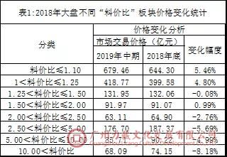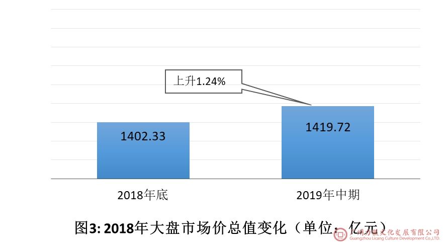 如图3所示,2019年中期与2018年底对比,2018年大盘市场价总值增加17.39亿元,上涨幅度1.24%。
