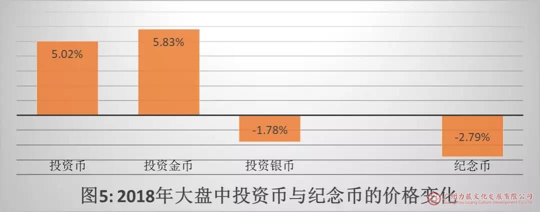 如图5所示,在2018年大盘市场价总值的变化中,投资币上涨5.02%,纪念币下跌2.79%。在投资币中,投资金币上涨5.83%,投资银币下跌1.78%。数据显示,引发2018年大盘上涨的主要原因是投资金币的价格上涨,而投资银币和纪念币整体继续呈现下跌态势。