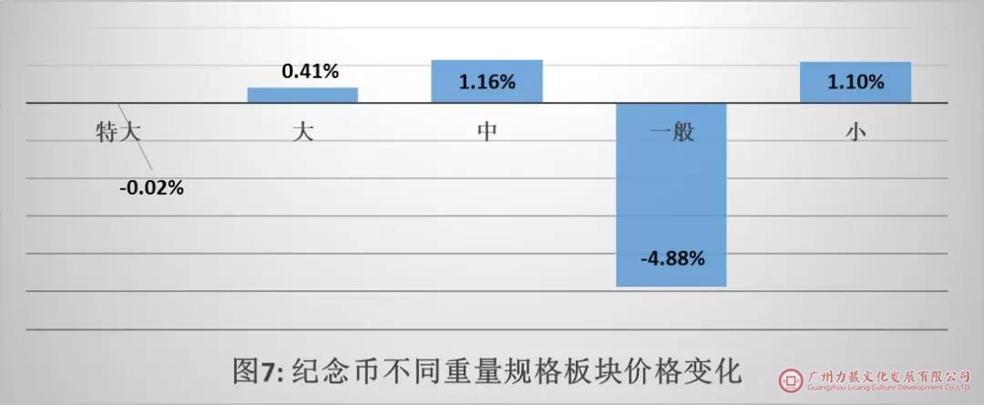 如图7所示,在不同重量规格板块中,大规格币种和中等规格币种处于上涨状态,而其它重量规格币种整体上处于下行态势,其中一般规格币种的下跌幅度最大,为4.88%。