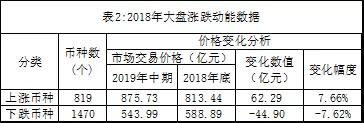 在2018年大盘市场价总值的变化中,涨跌币种的总动能状况见表2。