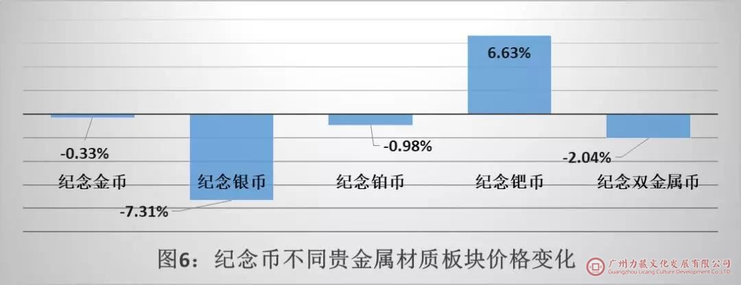 如图6所示,在不同贵金属材质板块中,仅有钯币录得上涨,其它板块均处于下跌状态,其中银币的下跌幅度最大,达到7.31%。