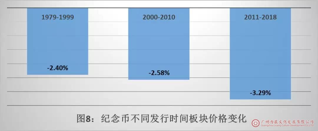 如图8所示,在不同的发行时间板块中,发行时间越近的板块下跌幅度越大,其中2011年至2018年发行币种的下跌幅度整体录得3.29%。