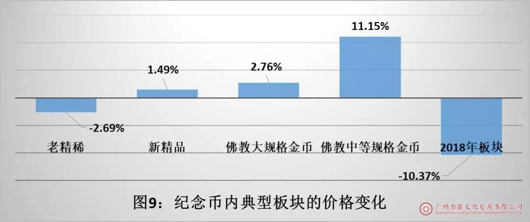 如图9所示:①在金币市场普遍关注的“老精稀”和“新精品”板块中,“老精稀”板块继续处于下行态势,“新精品”录得小幅上涨。②关于近期社会普遍关注的佛教题材大中规格金币的走势,数据显示这两个板块币种的价格确有上涨,其中佛教5盎司金币板块整体录得11.15%的涨幅。③特别值得关注的是2018年发行的纪念币板块,在新品高开低走的市场惯性作用下,2019年上半年整体继续加速下行,录得10.37%的大幅度下跌,出现整体跌破零售价的尴尬局面,成为2018年大盘纪念币下跌的重灾区。