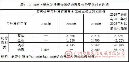 2019年新发币种零售价溢价率见表4,对比的基准是与其最为临近年度的相同材质币种的零售价溢价率。