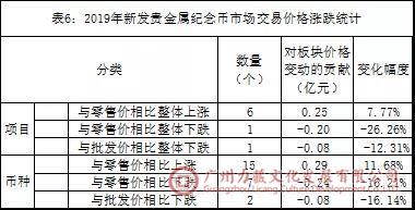 如表6所示:市场交易价格与零售价相比:①在2019年上半年新发的项目中有6个项目的市场价整体高于零售价,有1个项目整体低于零售价,它是“2019年中国北京世界园艺博览会贵金属纪念币”项目,而且这个项目也整体跌破批发价。②在2019年上半年新发的22个币种中有15个币种的市场价高于零售价,有7个币种跌破零售价,有2个币种跌破批发价。