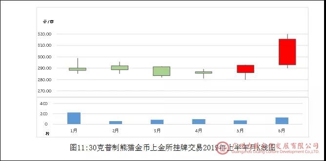 2019年上半年30克普制熊猫金币在上金所交易的K线图见图11。交易数量和交易金额按单向成交量计算。