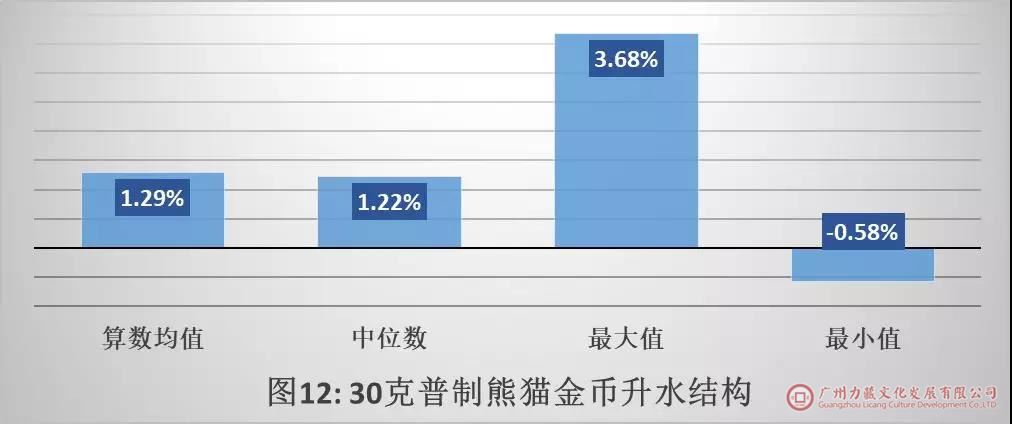 如图12所示,在上半年96个有效交易日中,30克普制熊猫金币的交易价格升水最高3.68%,最低-0.58%,算数均值1.29%,中位数1.22%。